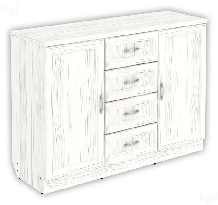 Четыре выдвижных ящика, размещенных в центральной части комода, укомплектованы ручками, расположенными по центру передней панели, а выдвижной механизм состоит из роликов, которые движутся по специальным направляющим. Обе боковые части оснащены дверьми, которые ограничивают доступ к внутреннему пространству, разделенному полочкой.