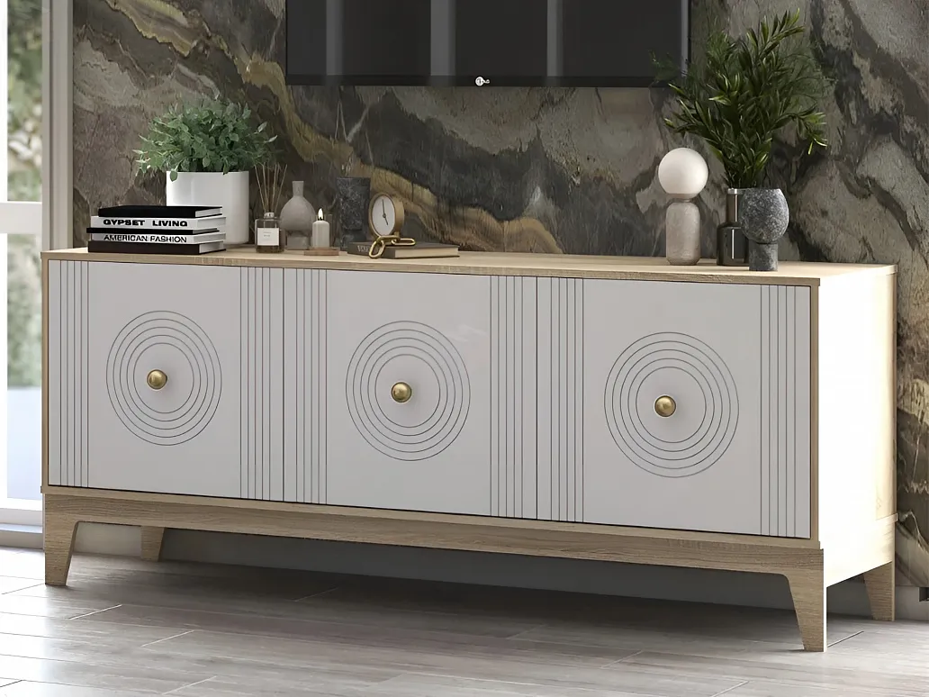 Комод-тумба с фасадами МДФ с современной фрезеровкой в виде вертикальных полос и кругов. Фасады в пленке "белый софт" тактильно напоминают шелковую ткань.