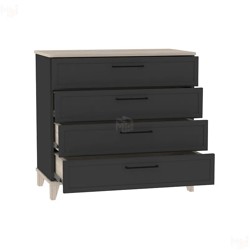 Шариковые направляющие полного выдвижения в ящиках обеспечивают плавный, мягкий, бесшумный ход на протяжении всего срока эксплуатации. Донья ящиков в древесном декоре придают мебели коллекции Aurelio дополнительную эстетику. Комод установлен на опоры МДФ без цоколя. Высота опоры 80 мм - оптимальна для современных моделей роботов-пылесосов. -