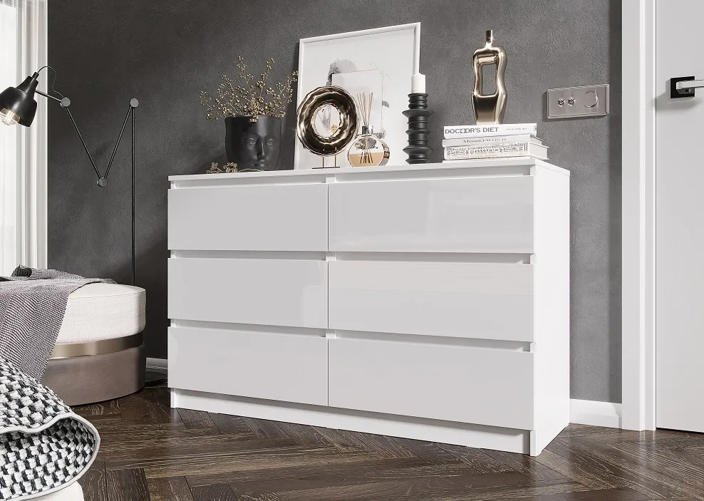 Комод выполнен из ЛДСП белого цвета, фасады ЛДСП Белый глянец.