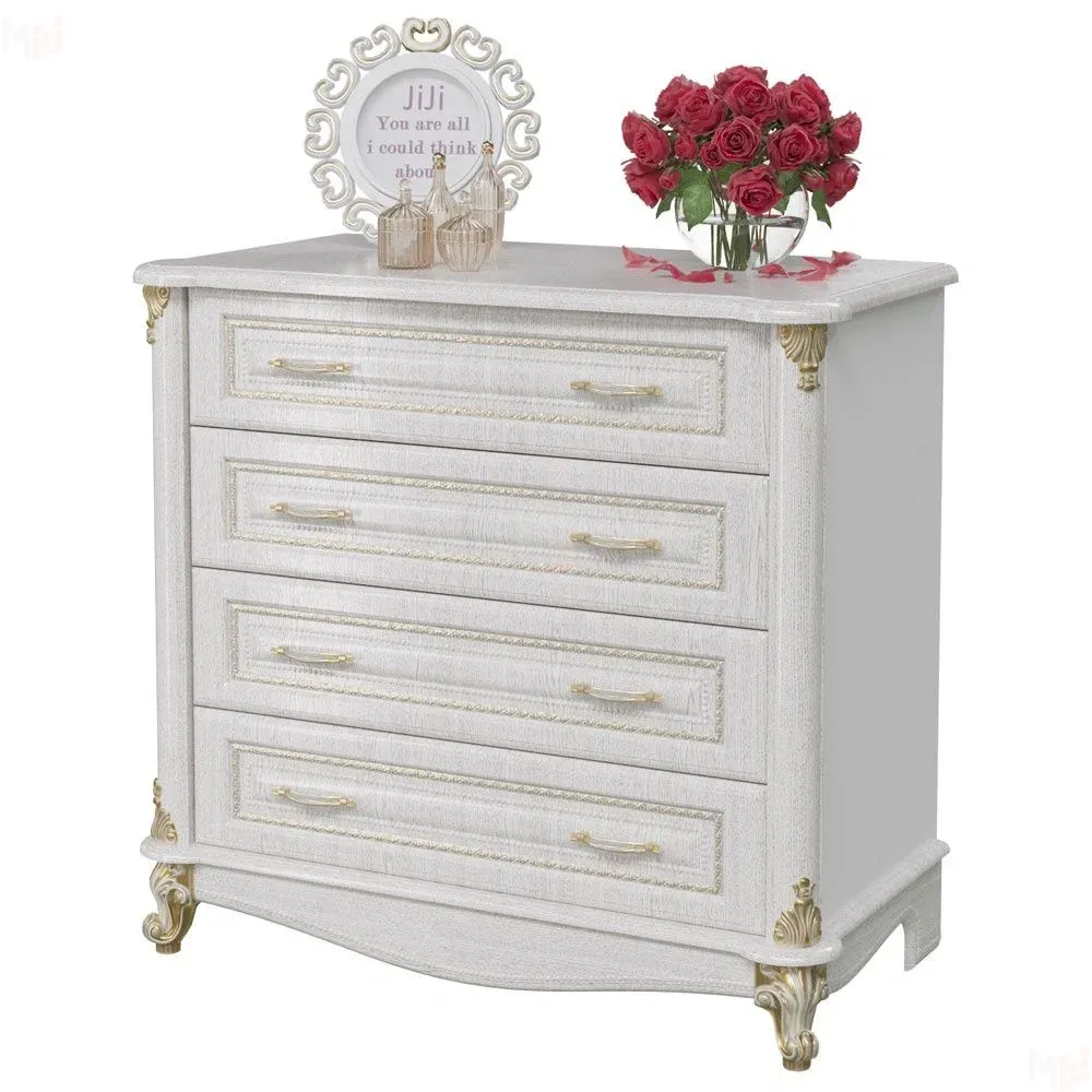 - Ажурные розетки с кристаллами, фигурные карнизы и изогнутые ножки с флористическим орнаментом, ручки под старину утончённо украшают модели.