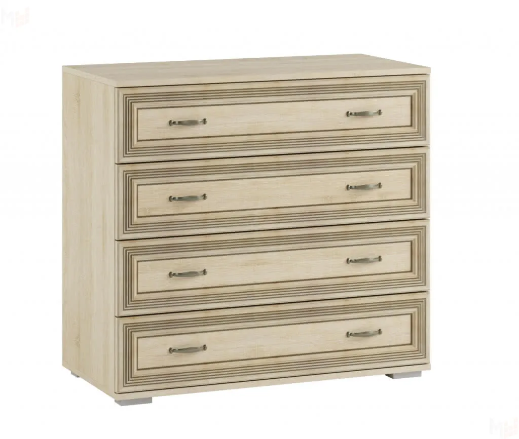 В широком комоде с четырьмя ящиками хватит места для хранения одежды и постельного белья.