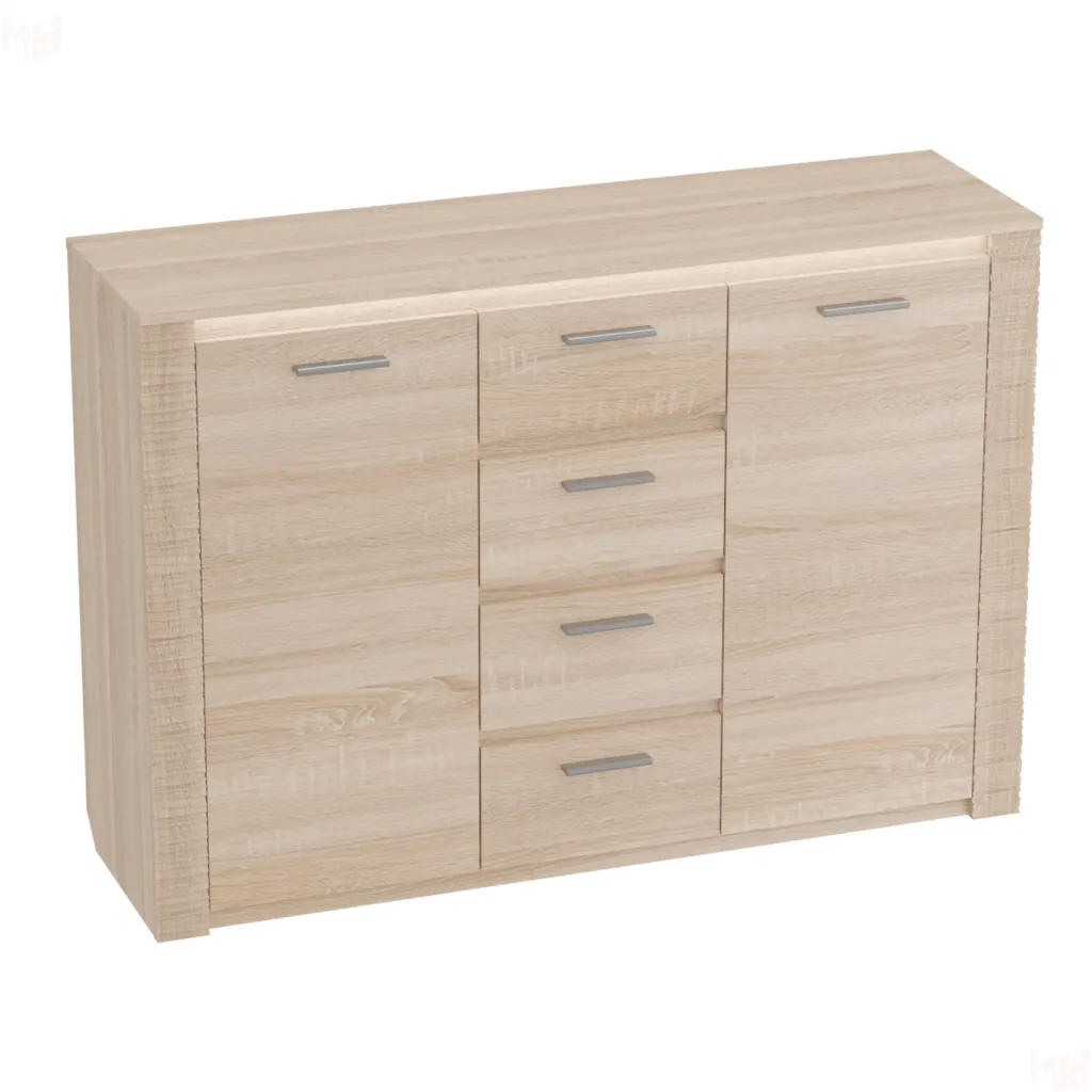 Комод имеет четыре выдвижных ящика в центральной части, два отделения за распашными дверями.