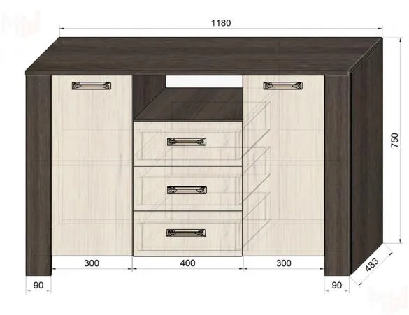 Наполнение комода Фанки Тайм ФТ-01 - два боковых шкафчика, три выдвижных ящика и верхняя открытая ниша.