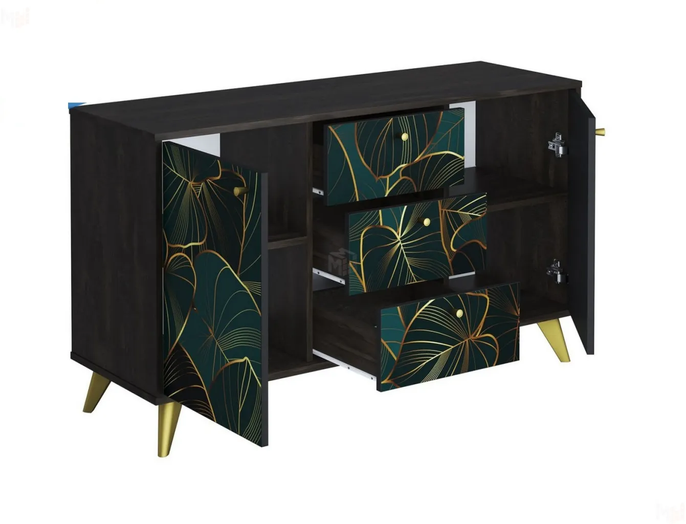 Комод имеет три вместительных выдвижных ящика на надежных роликовых направляющих, а также две секции с полками, каждая полка выдерживает до пяти килограммов распределённой нагрузки