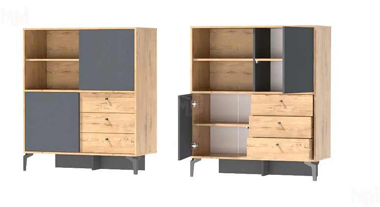 Современный комод оснащен тремя выдвижными ящиками на шариковых направляющих полного выдвижения.