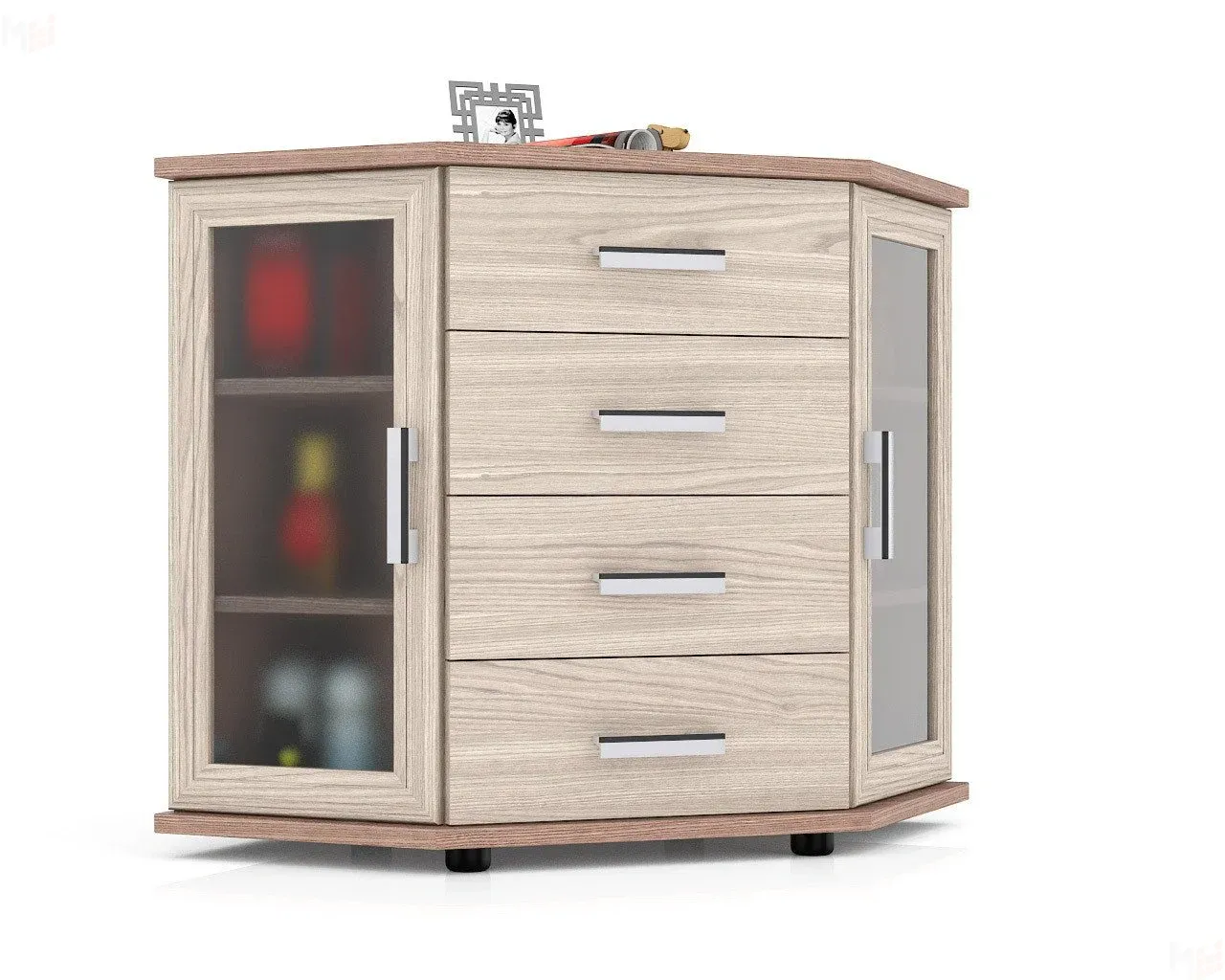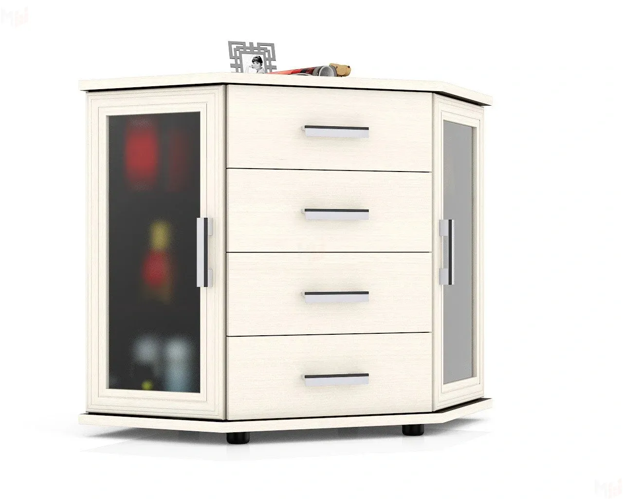 В конструкции четыре выдвижных ящика, органично дополнены изящными боковыми отделениями-витринами. Стекло тонированное. Цвет на выбор: венге/дуб молочный, ясень шимо темный/светлый.