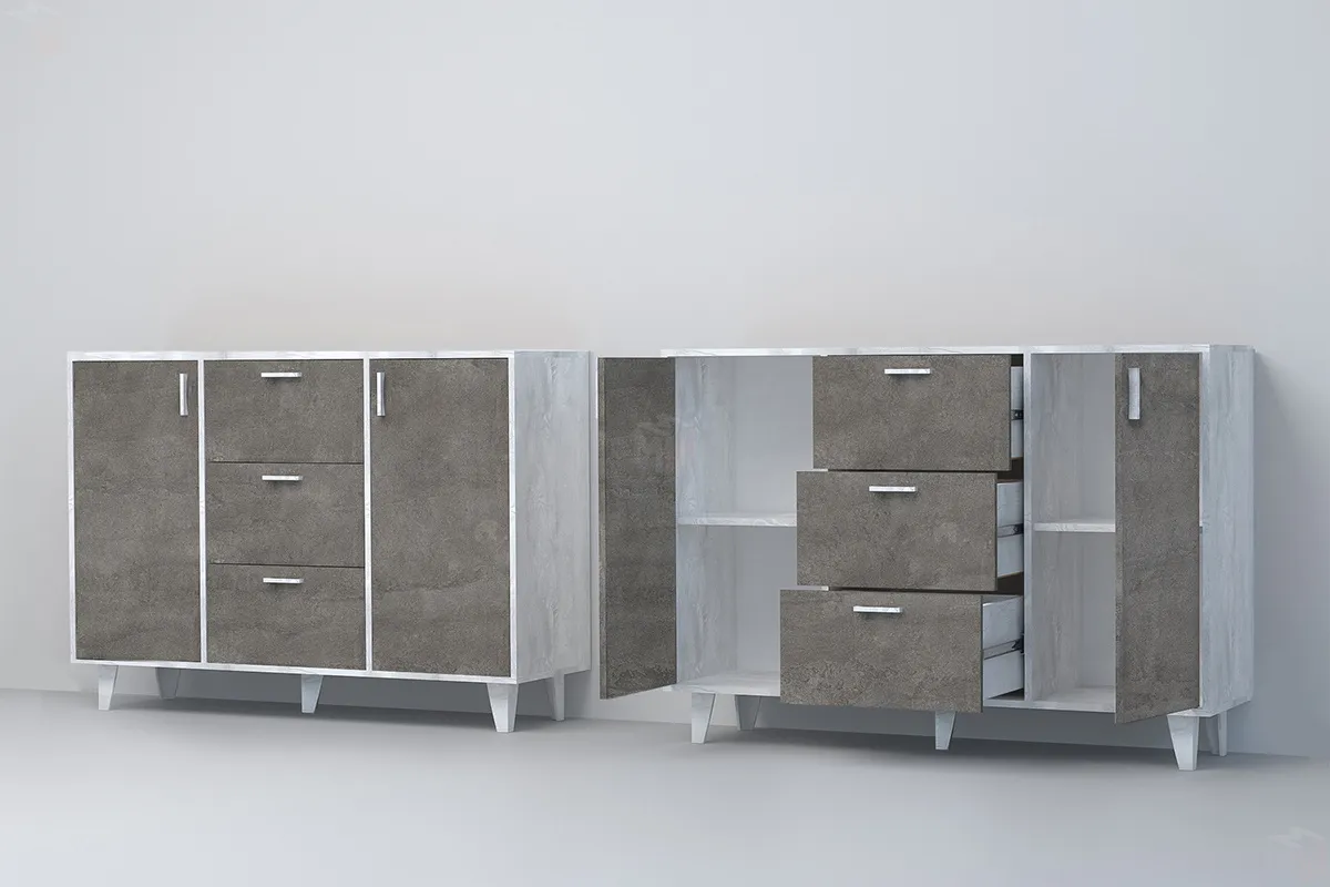 Комод оснащен тремя выдвижными ящиками на шариковых направляющих полного выдвижения и двумя дверками.