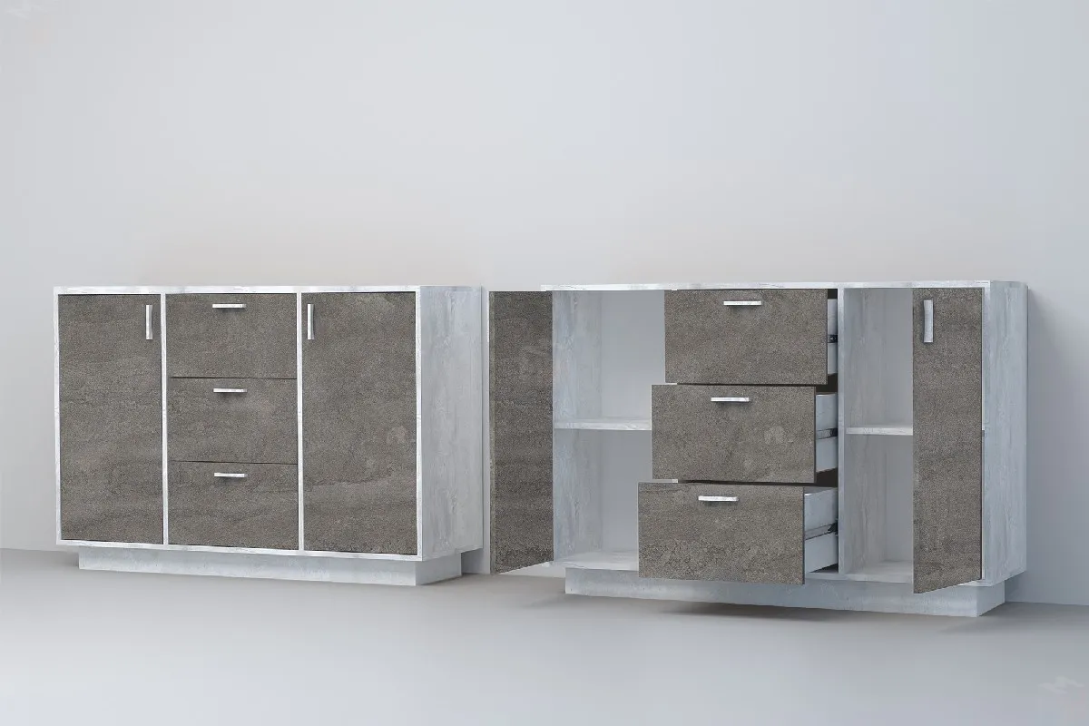 Комод оснащен тремя выдвижными ящиками на шариковых направляющих полного выдвижения и двумя дверками.