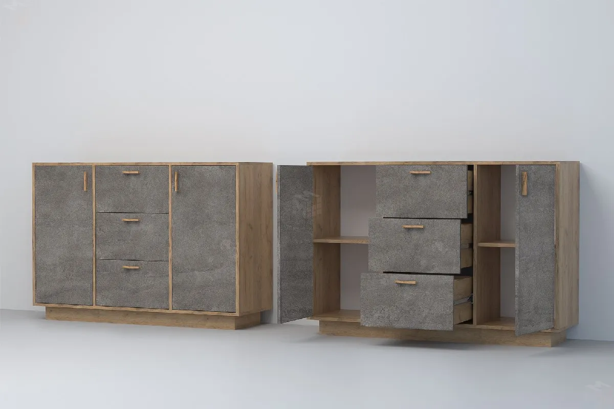 Комод оснащен тремя выдвижными ящиками на шариковых направляющих полного выдвижения и двумя дверками.