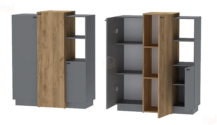 Разноуровневый комод оснащен тремя дверками с петлями с доводчиками.