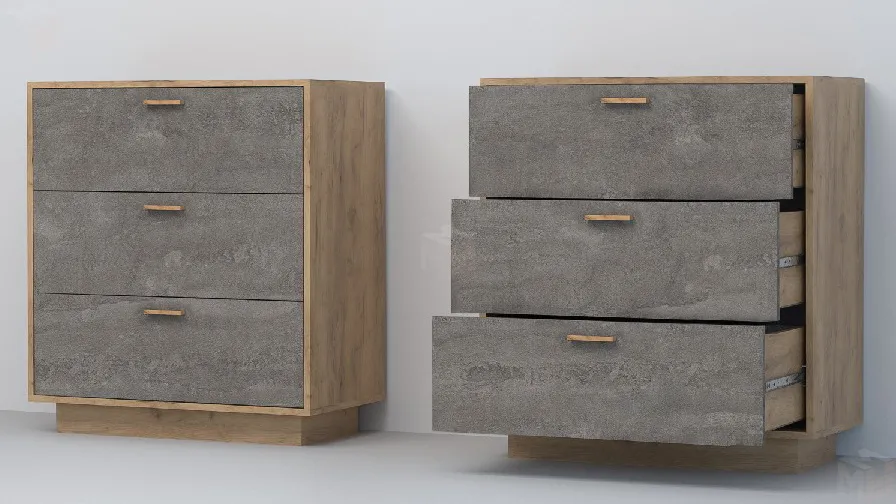 Современный комод оснащен тремя просторными выдвижными ящиками на шариковых направляющих полного выдвижения.