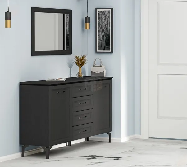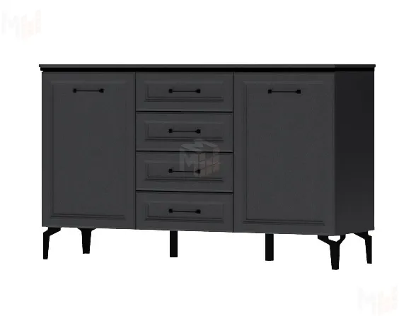 Комод с четырьмя выдвижными ящиками и двумя закрытыми нишами с полками внутри - удобная и полноценная система хранения, идеально подходящая для любого помещения: спальни, гостиной, рабочего кабинета, прихожей. В нём можно хранить текстиль, постельные принадлежности, нижнее бельё, косметику, документы, а столешницу использовать как функциональную полку для приятных мелочей: статуэток, красивых ваз, светильника, семейных фотографий. Цвет - антрацит. Фасады МДФ.