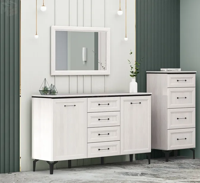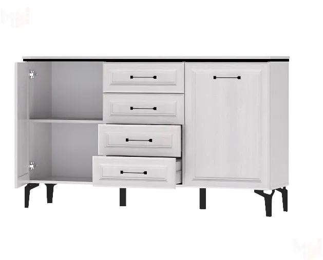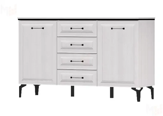 <b>Комод </b>с четырьмя выдвижными ящиками и двумя закрытыми нишами с полками внутри - удобная и полноценная система хранения, идеально подходящая для любого помещения: спальни, гостиной, рабочего кабинета, прихожей. В нём можно хранить текстиль, постельные принадлежности, нижнее бельё, косметику, документы, а столешницу использовать как функциональную полку для приятных мелочей: статуэток, красивых ваз, светильника, семейных фотографий.