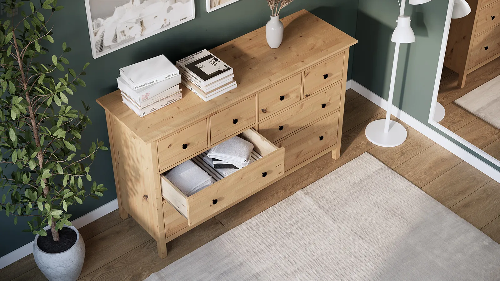 Шиpокий комод обеспечит достаточно места для хранения, а на его верхнюю панель можно поставить лампу и другие предметы, которые вы хотите продемонстрировать.