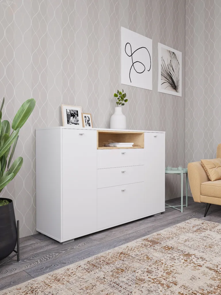 В верхней части расположен открытый отсек, ниже выдвижные ящики. Бо бокам распашные дверцы.