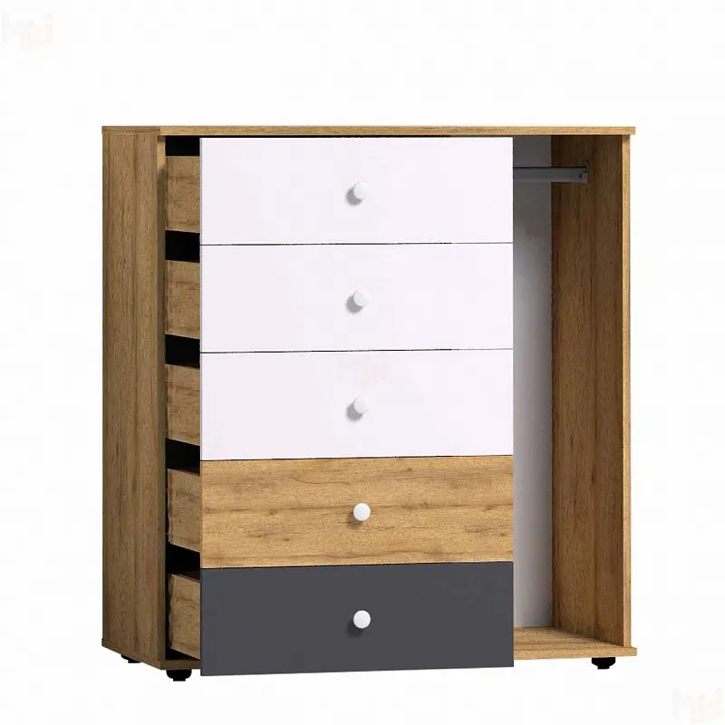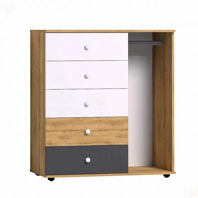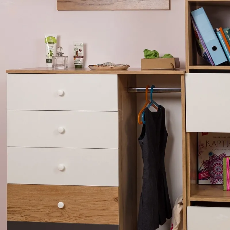 Мы нашли компромиссное решение этой вечной проблемы: Комод 87 с рядом выдвижных ящиков и со стационарной штангой в нише без фасадов для хранения школьной формы или домашней одежды. Оригинальный комод с открытой нишей необходим в каждой детской для хорошего настроения!