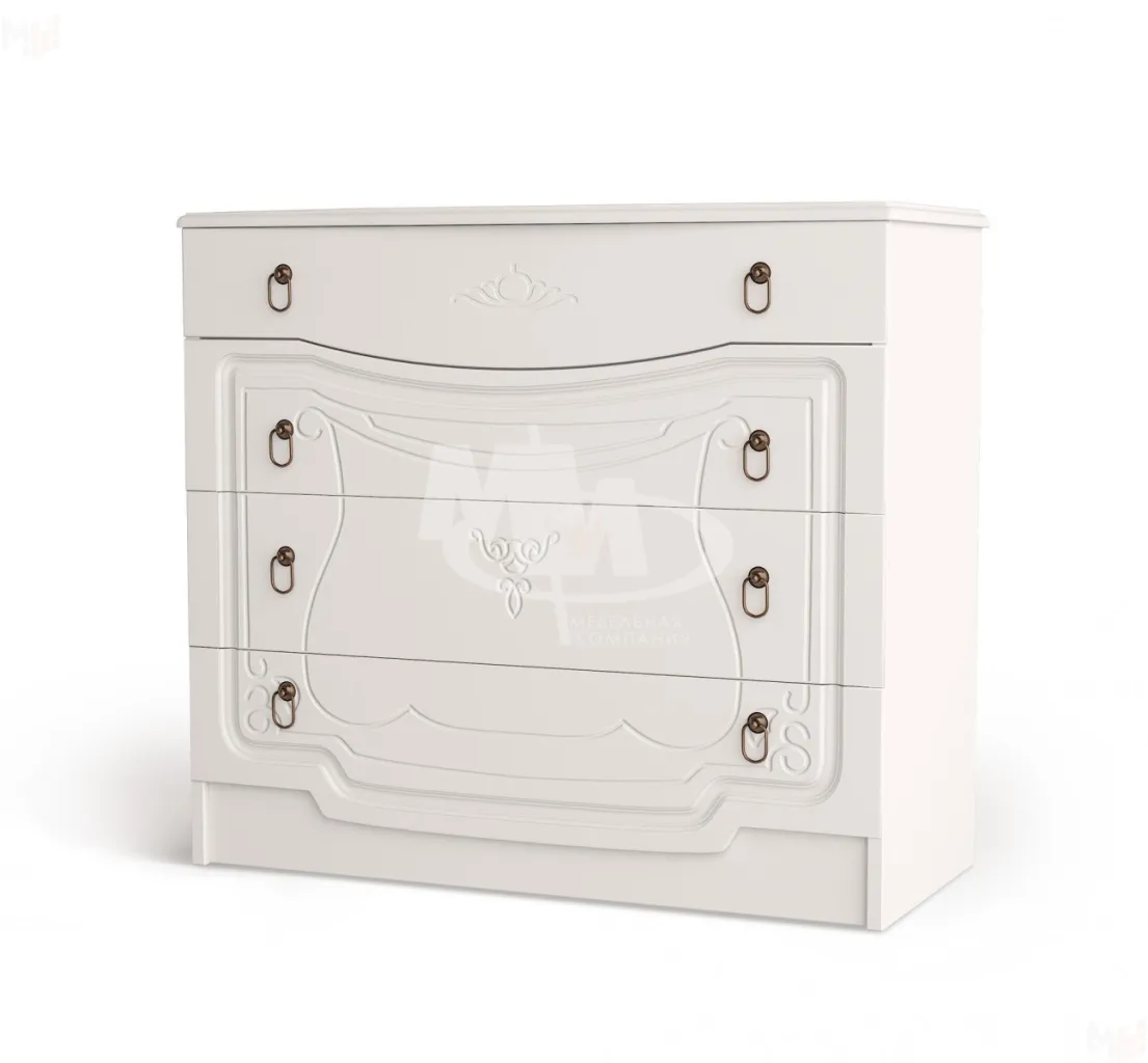 Комод является частью модульной спальни Мария. Корпус комода выполнен из ЛДСП белого цвета, фасады МДФ белый глянец.