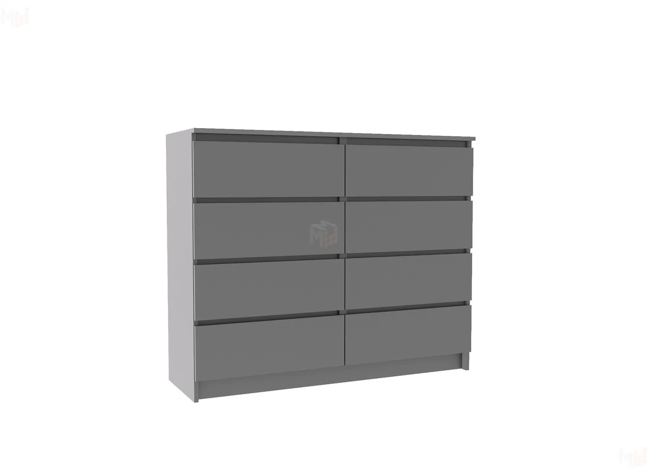 Комод разделен на две секции перегородкой, в каждой секции четыре выдвижных ящика на роликовых направляющих.