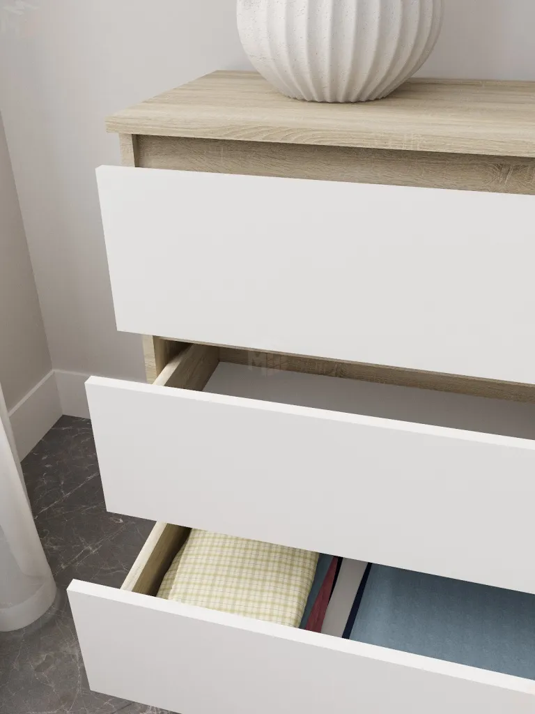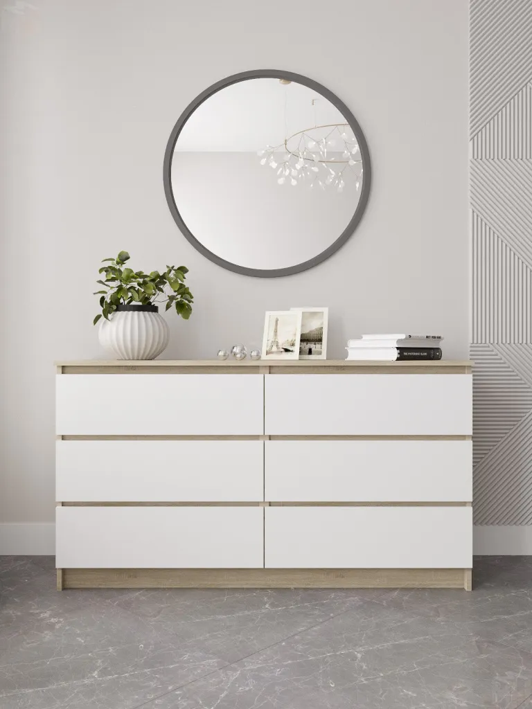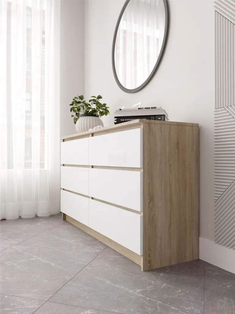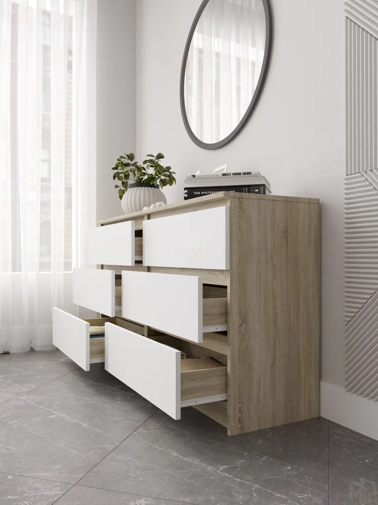Комод разделен на две секции перегородкой, в каждой секции три выдвижных ящика на роликовых направляющих.