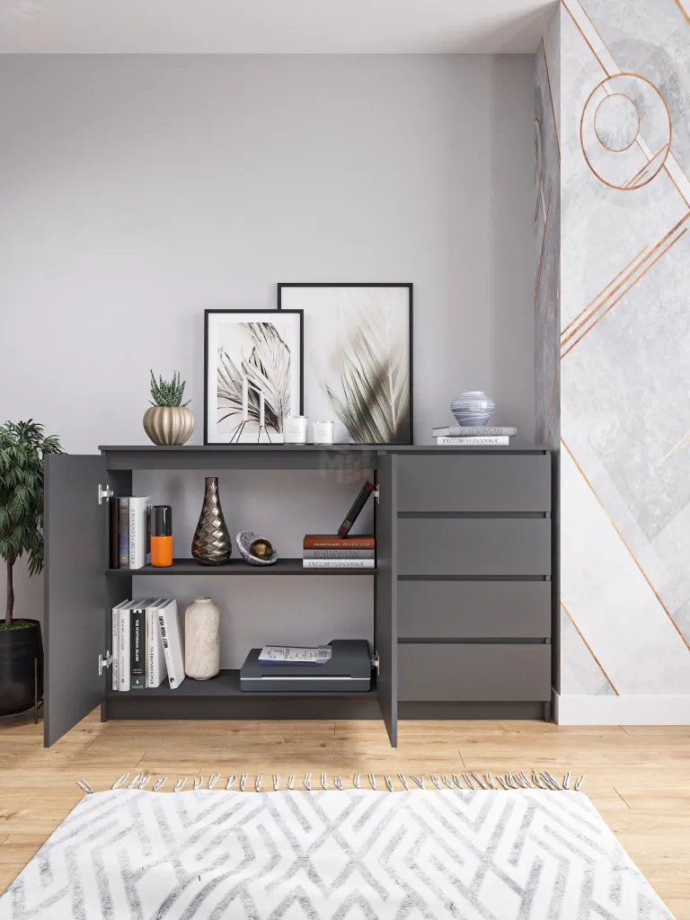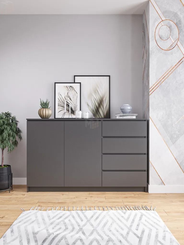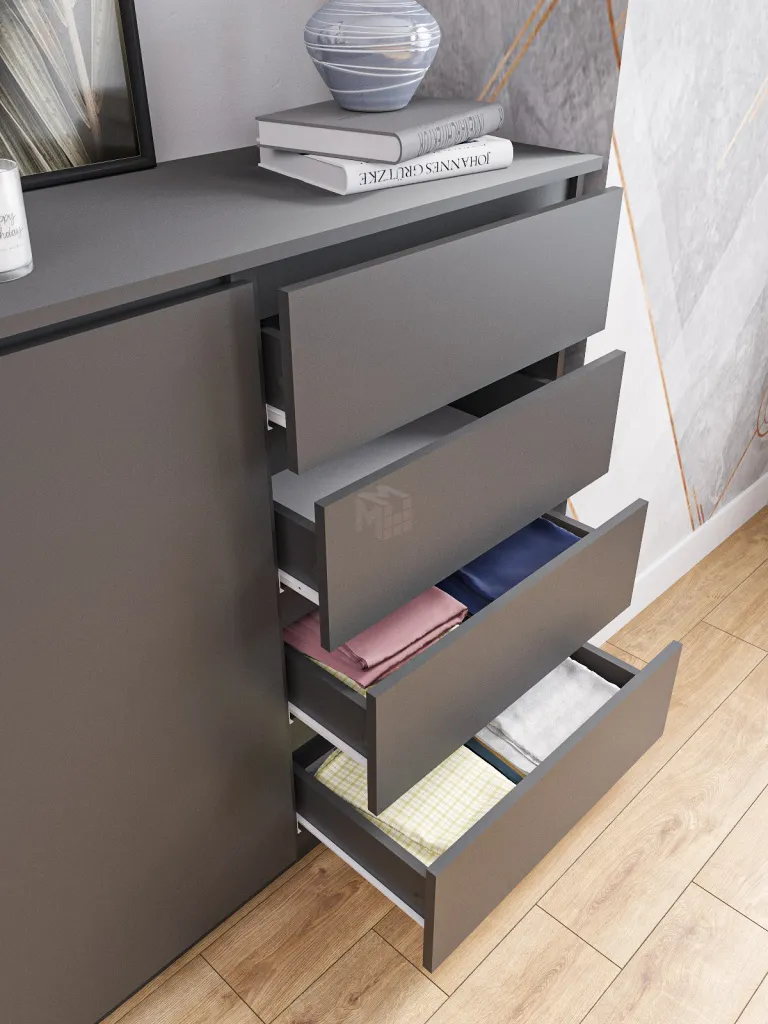 Комод разделен на две секции перегородкой, в каждой секции три выдвижных ящика на роликовых направляющих.