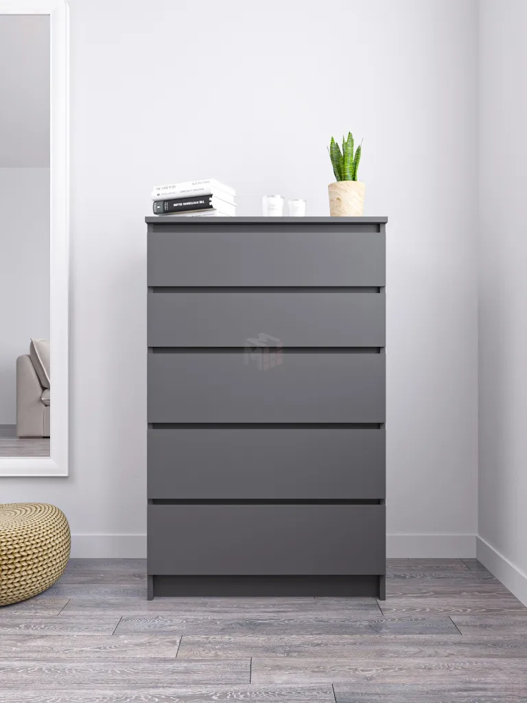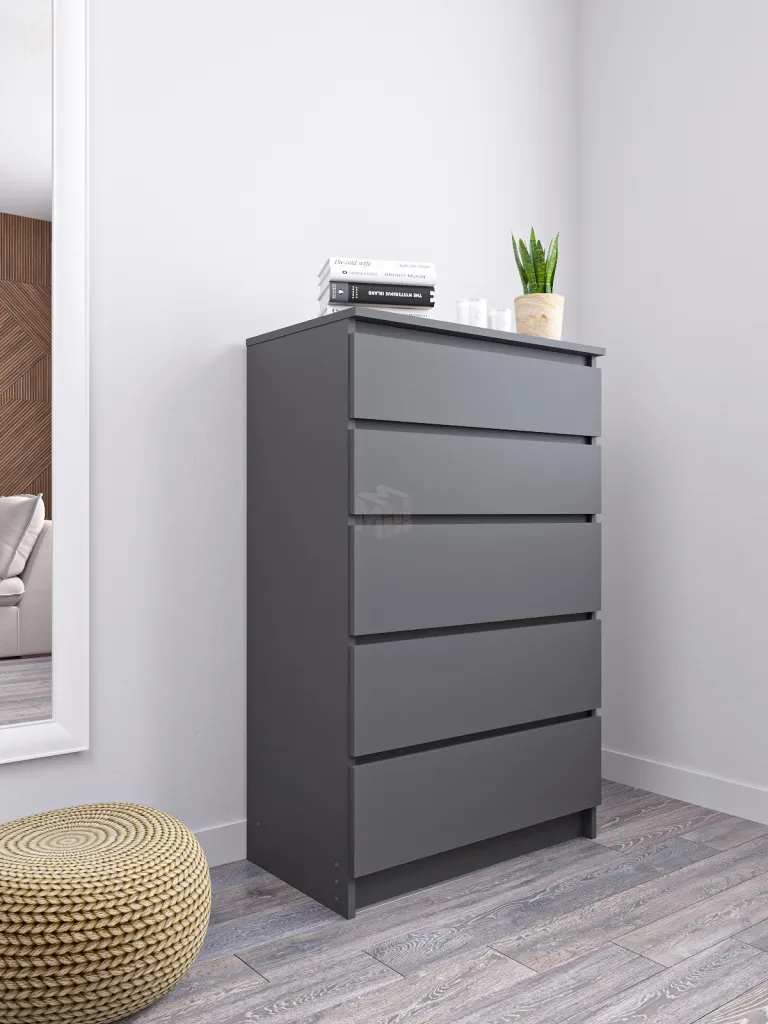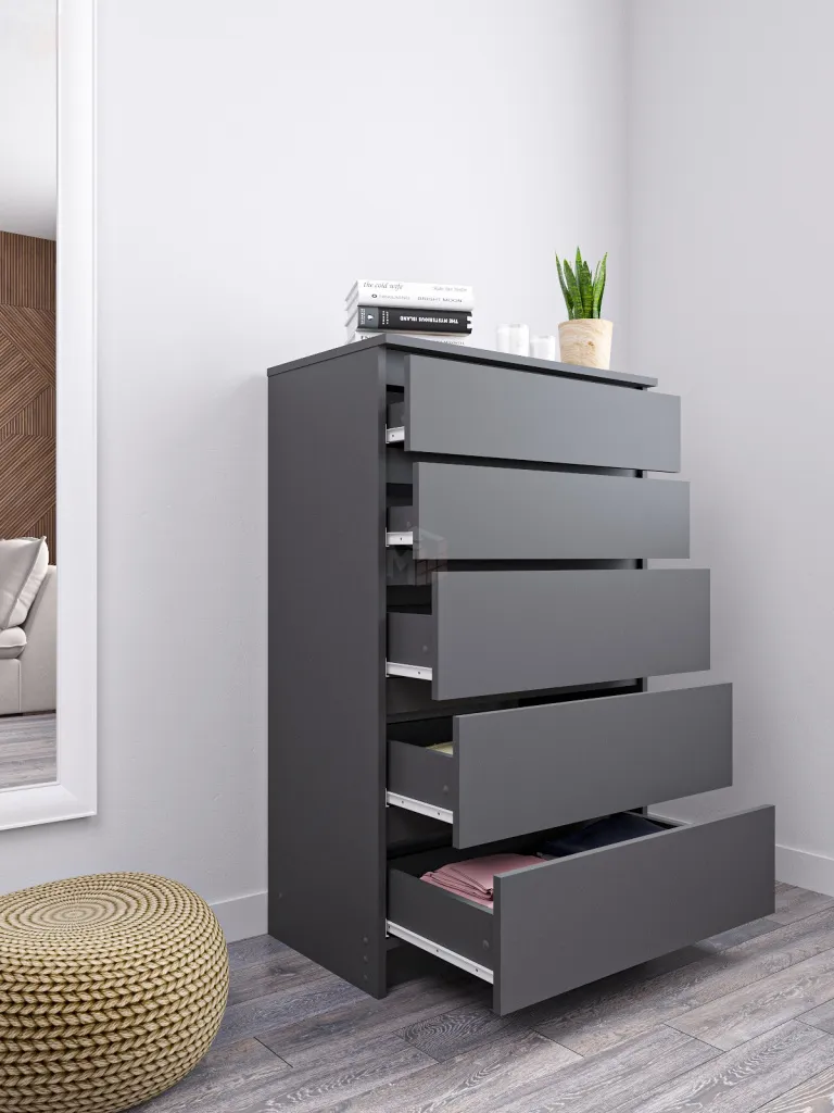 Комод разделен на две секции перегородкой, в каждой секции три выдвижных ящика на роликовых направляющих.