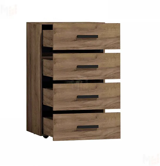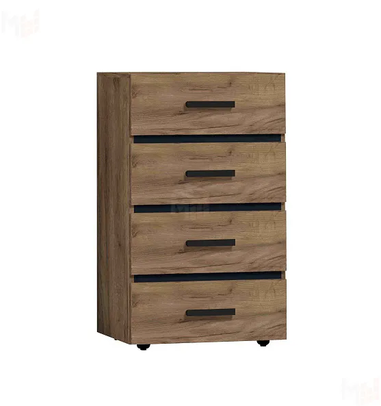 Для спальни отлично подойдет высокий комод Nature 45. Гладкие фасады ящиков в теплом декоре Дуб Табачный Craft с контрастными черными боковыми планками снизу делают его по-настоящему особенным. Четыре выдвижных ящика способны вместить все необходимое, а компактная конструкция сэкономит место в комнате. Ящики легко открываются благодаря направляющим полного выдвижения. Они быстро и легко устанавливаются при сборке комода. Регулируемые опоры компенсируют незначительные неровности пола.