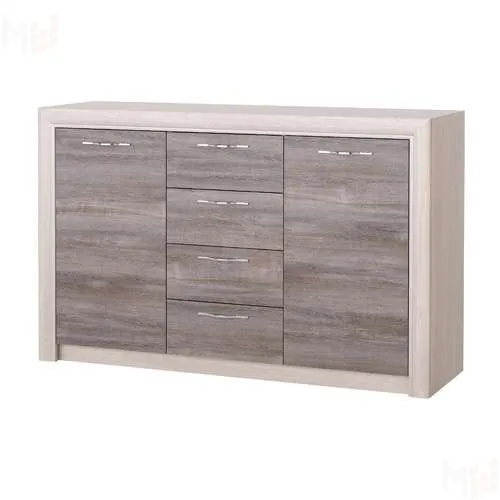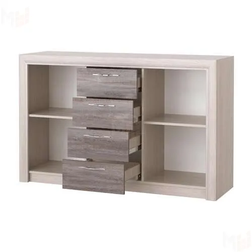 Комод 2С4Я "Октава" 2-створчатый с 4-мя ящиками на шариковых направляющих полного выдвижения. Устанавливается стильная металлическая ручка, декор "тёмный никель". Периметр комода обрамлён профилем MDF оригинальной формы с патиной (окраской фасок) серебристого цвета.