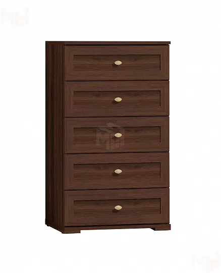 Данная модель комода имеет 5 выдвижных ящиков. Ящики имеют надежный выдвижной механизм, высокую весовую устойчивость. За счет своей высоты (1,042 м) и небольшой ширины (0,602 м.) комод занимает минимальное пространство. Изюминкой внешнего вида комода является многогранная форма крышек ящиков.