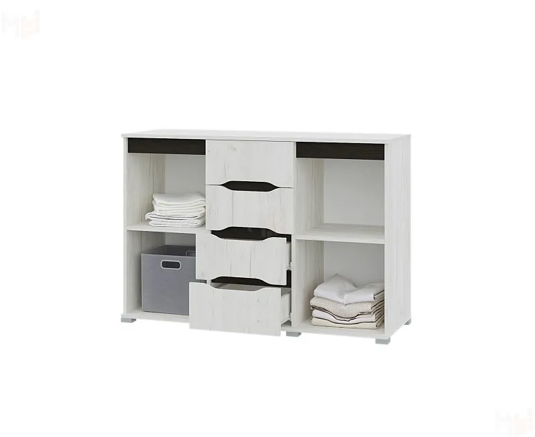 Ящики комода Вега выдвигаются при помощи роликовых направляющих.