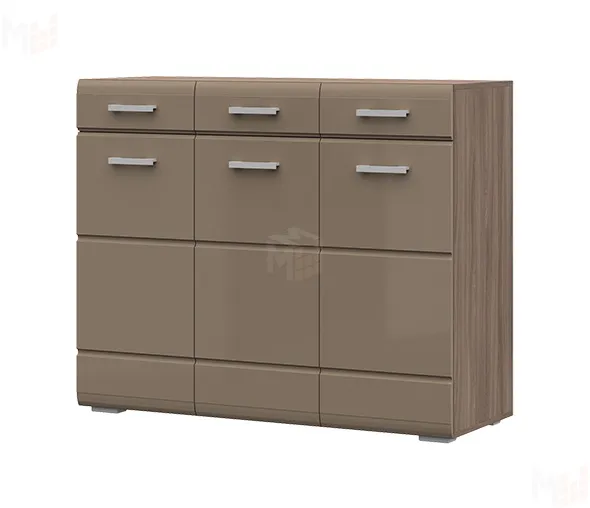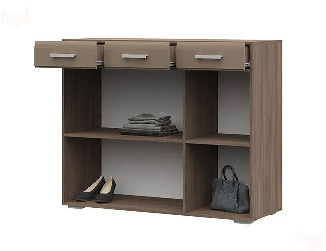 Вместительный комод с тремя выдвижными ящиками для хранения мелких предметов. За дверцами расположены вместительные полки для вещей.