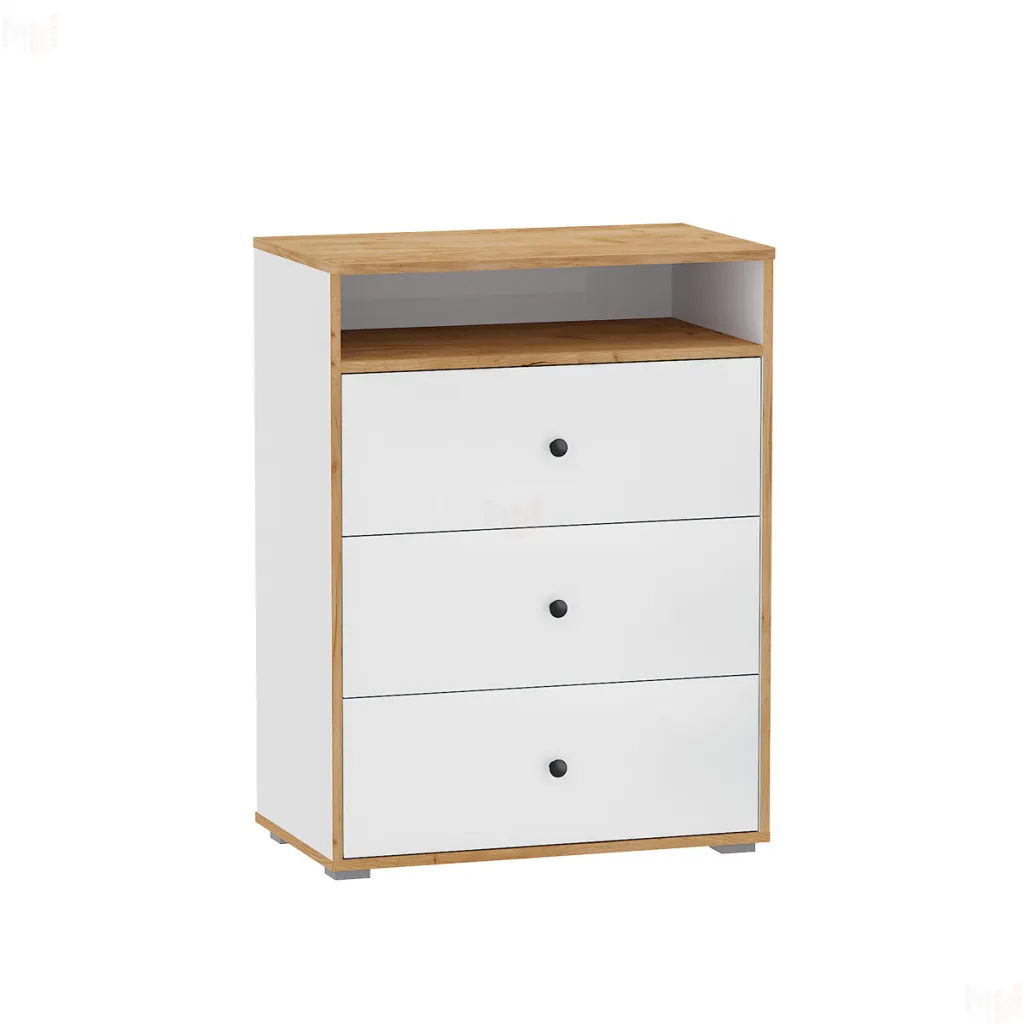 Комод Вуди 13.293 будет отличным дополнением интерьера уютной детской. Три вместительных выдвижных ящика пригодятся для хранения одежды, белья, различных аксессуаров, украшений и косметики. Открытую нишу и поверхность комода можно использовать для размещения интересных книг, наград и грамот, любимых игрушек и оригинальных предметов декора.