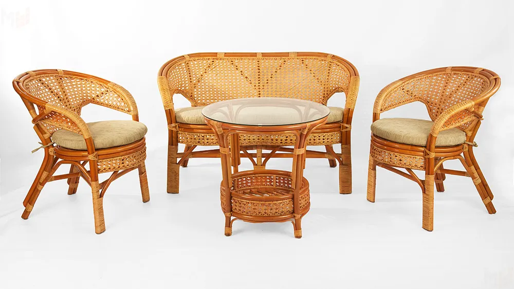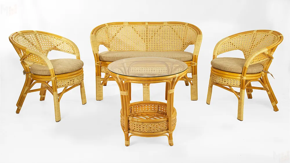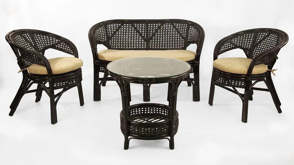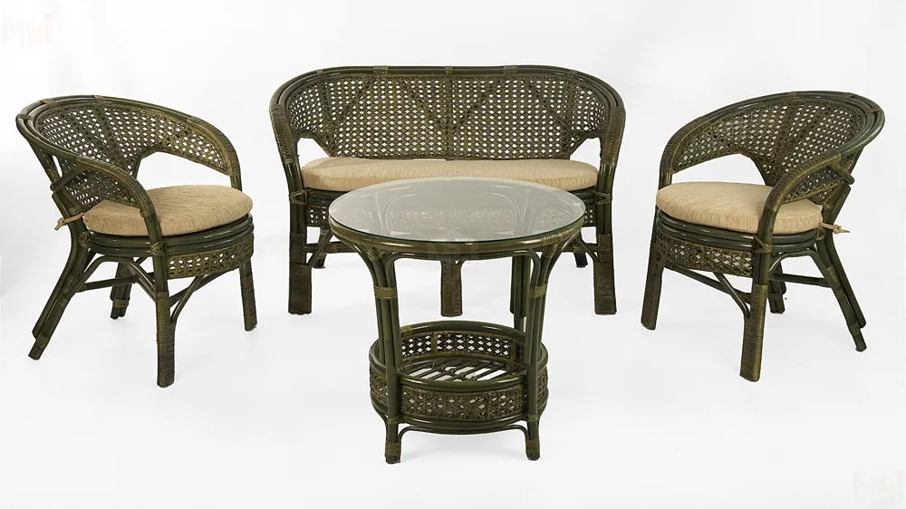 Комплект мебели для террасы 02/15 включает в себя: 2 кресла, плетеный двухместный дива и круглый столик журнальный, подушки из качественного материала.