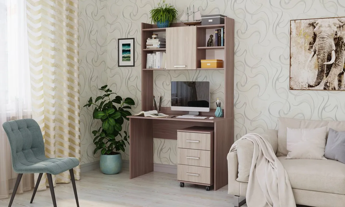 Письменно-компьютерный стол ПКС-9 с надстройкой, с выкатной тумбой с 3-мя ящиками на направляющих полного выдвижения. Надстройка и выкатная тумба приобретаются опционально. Для удобства открывания и удержания фасада в открытом положении устанавливается газлифт. Столешница обработана кромкой толщиной 1 мм, что делает работу за столом более комфортной и удобной.