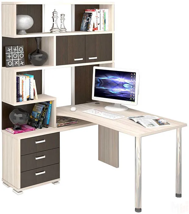 Стол для компьютера с надстройкой – это гибрид эргономичной столешницы на хромированных цилиндрических ножках и удобного книжного шкафа. В целях экономии пространства эти «2 в 1» совмещены в компактную угловую композицию, которая может быть решена как в левостороннем, так и в правостороннем варианте.