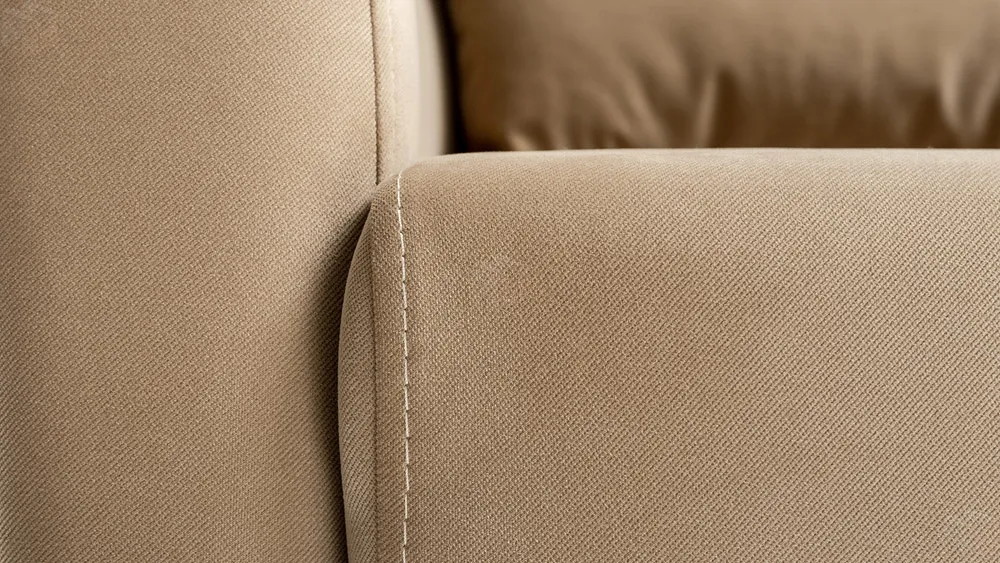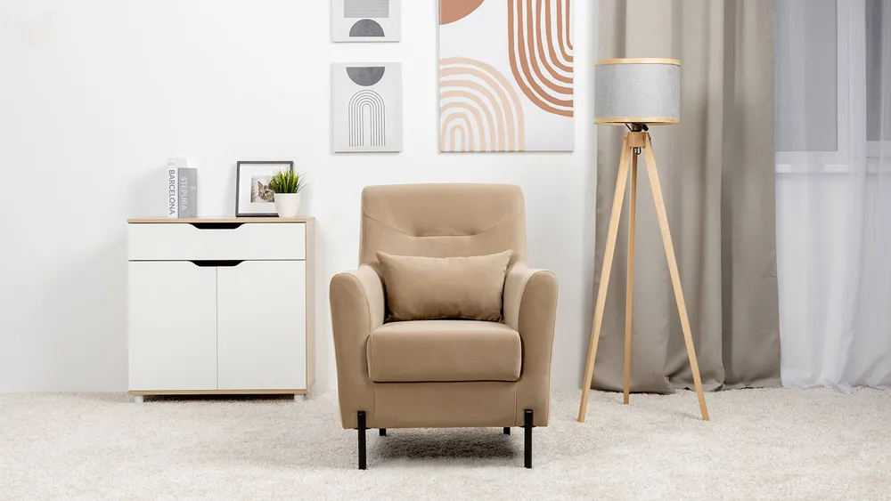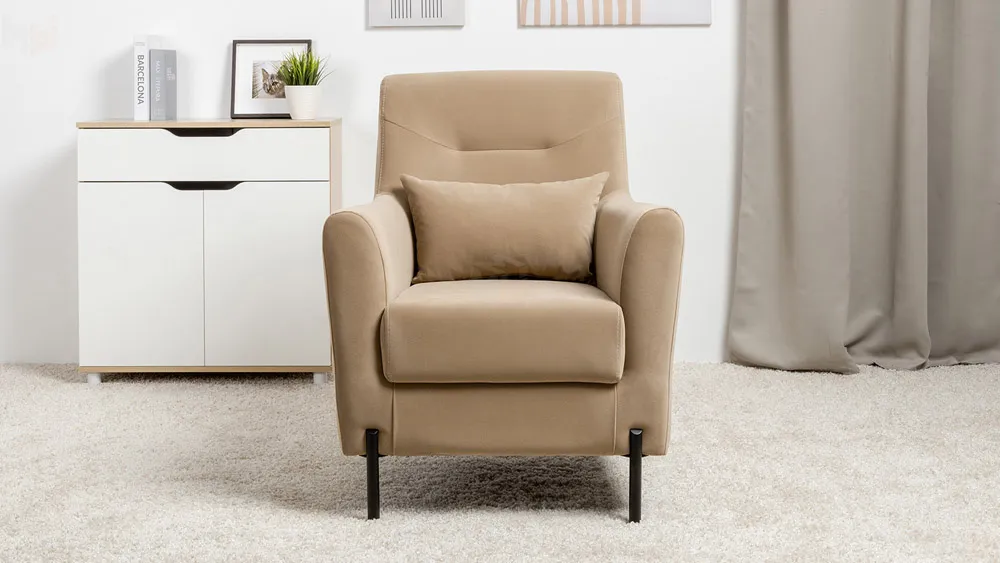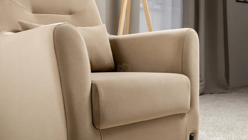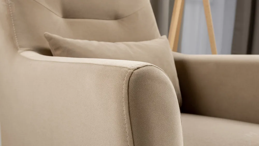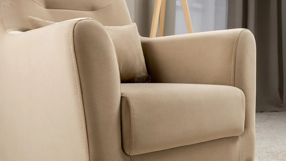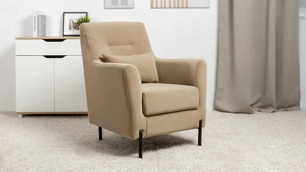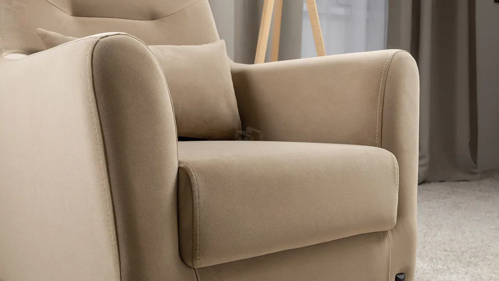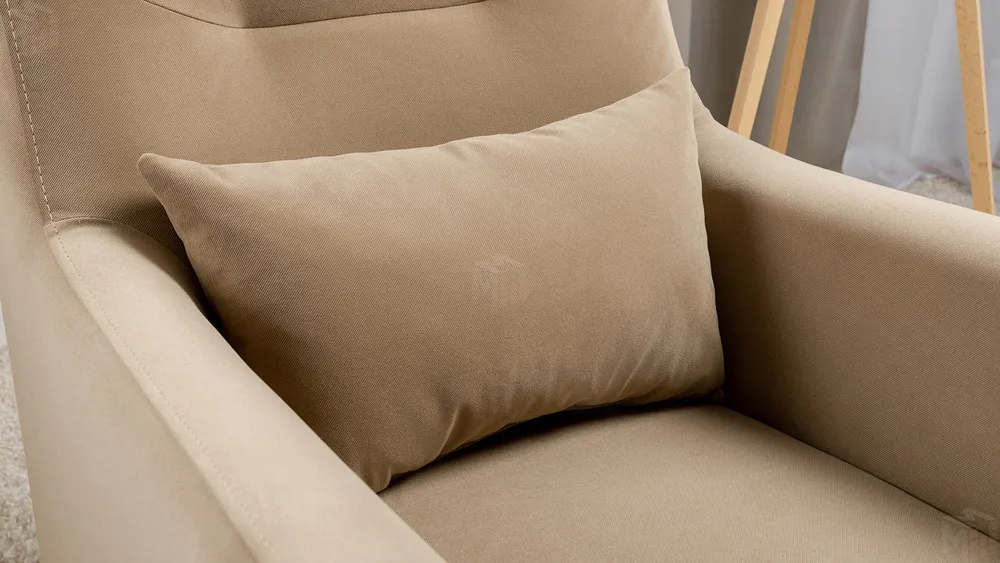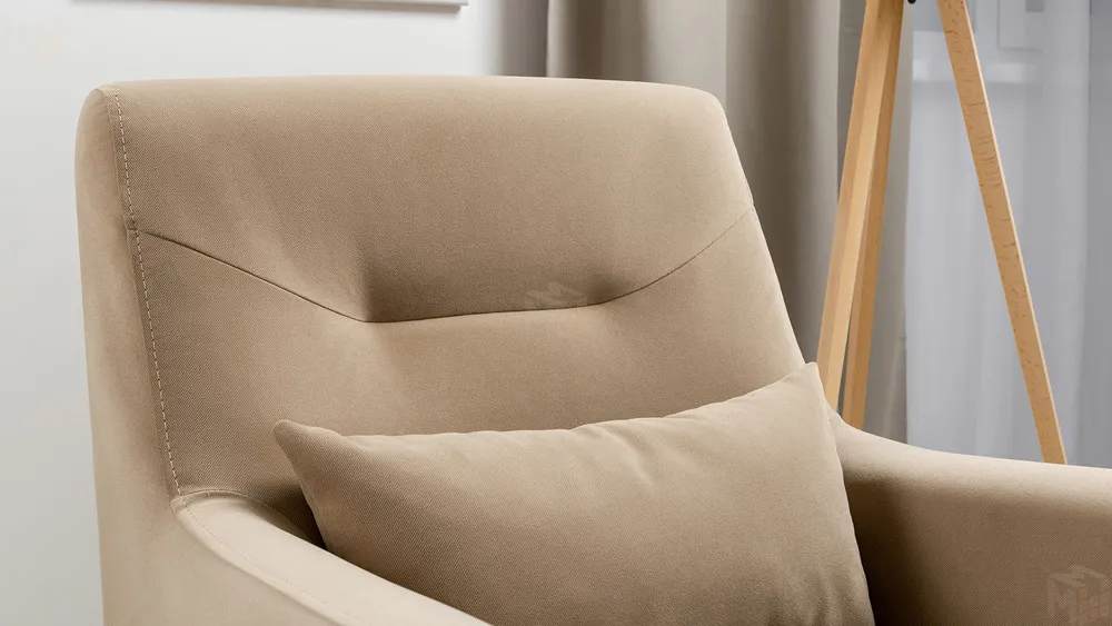 Декоративная утяжка на спинке кресла, декоративная подушка в цвете кресла, металлические опоры переходят в декоративный элемент подлокотника