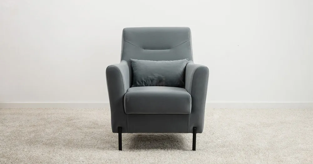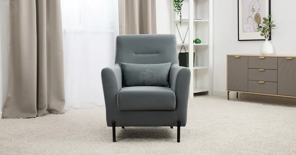 Декоративная утяжка на спинке кресла, декоративная подушка в цвете кресла, металлические опоры переходят в декоративный элемент подлокотника