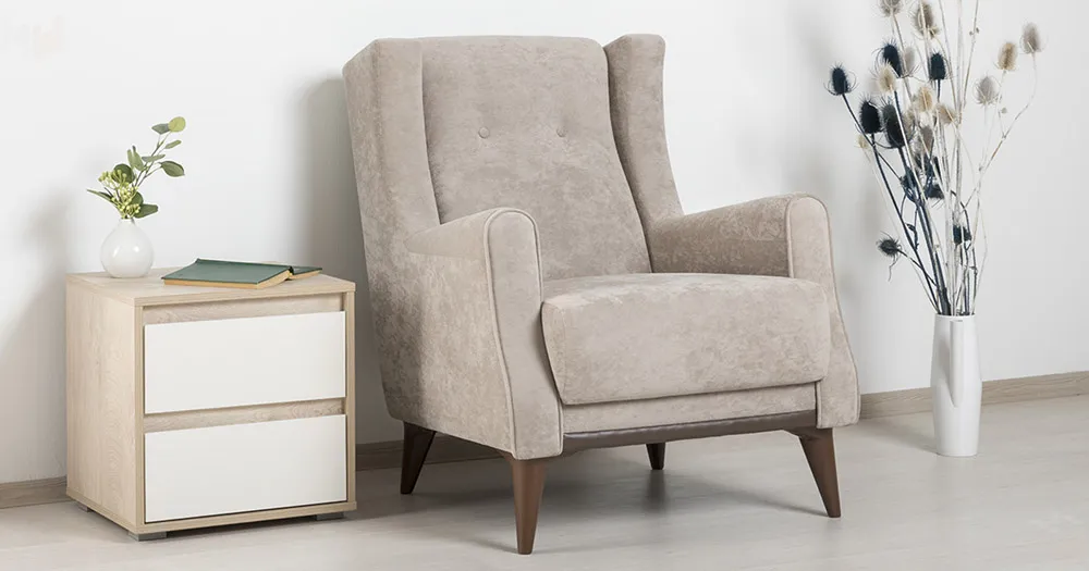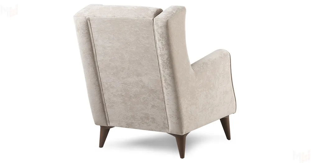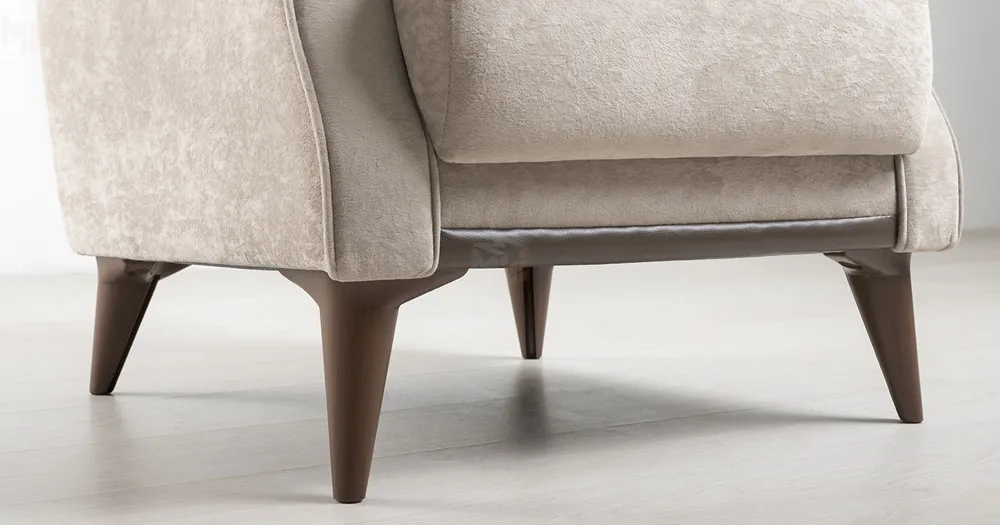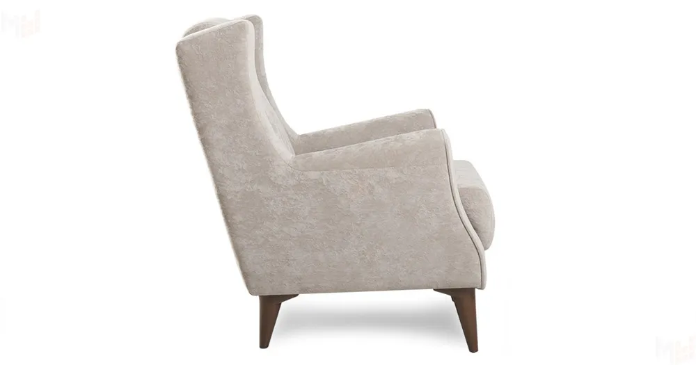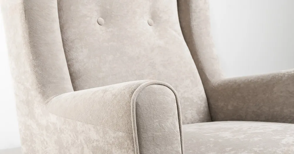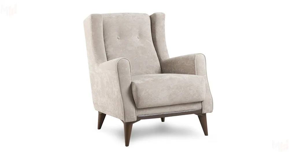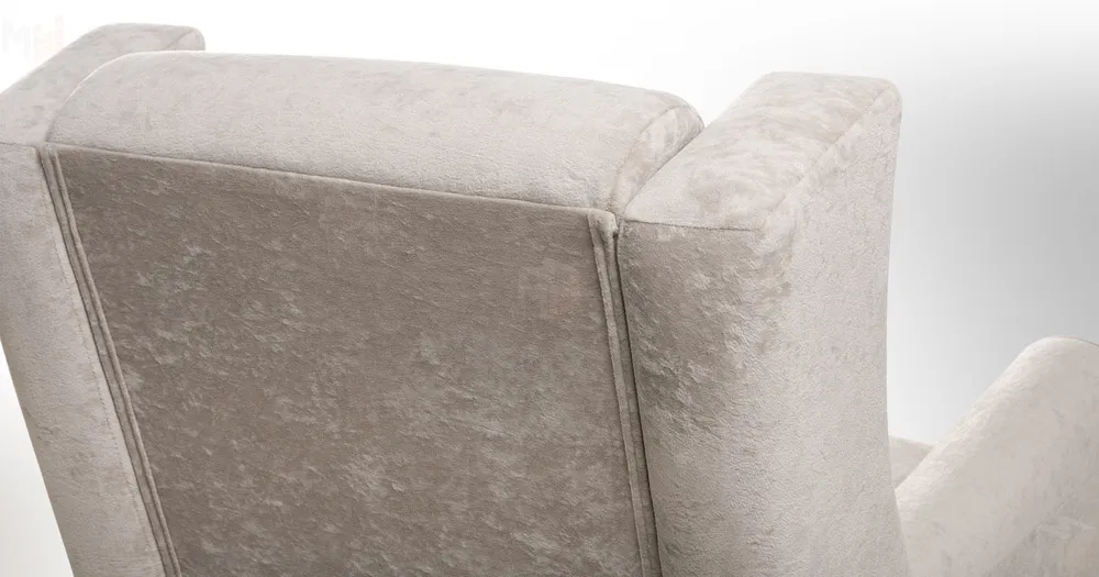 Декоративный кант из основной ткани по переднему торцу подлокотника; Утяжка спинки на 2 декоративные пуговицы из основного материала; Декоративный элемент царги из материала-компаньона.