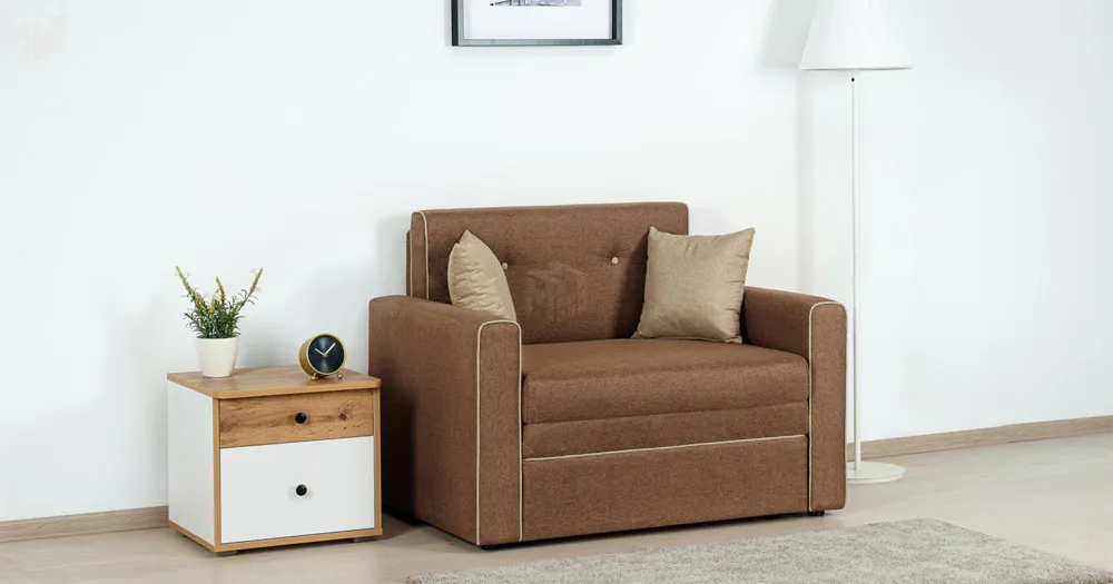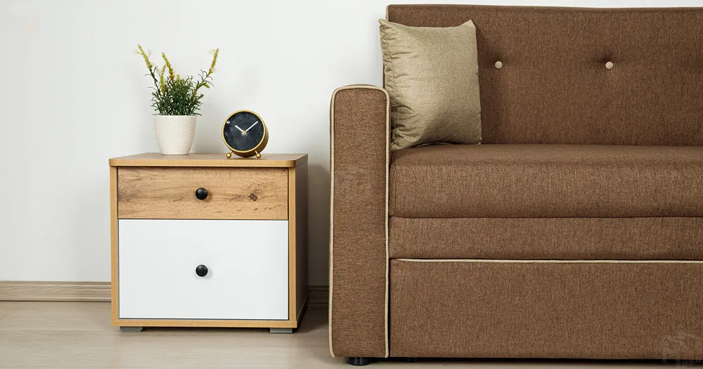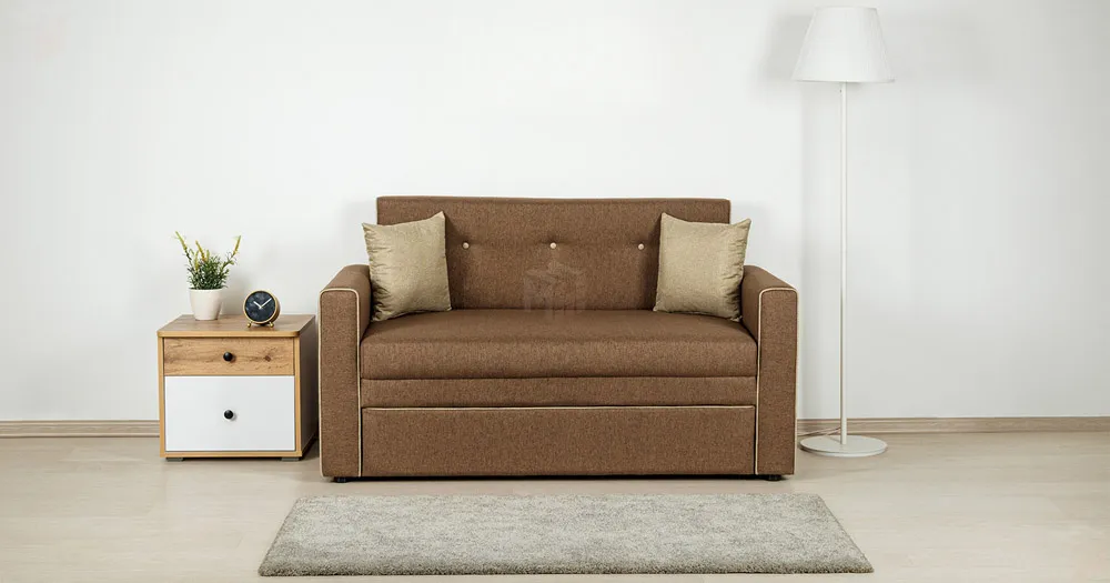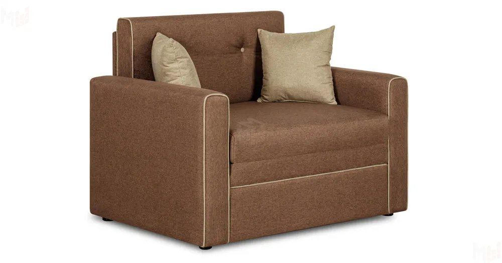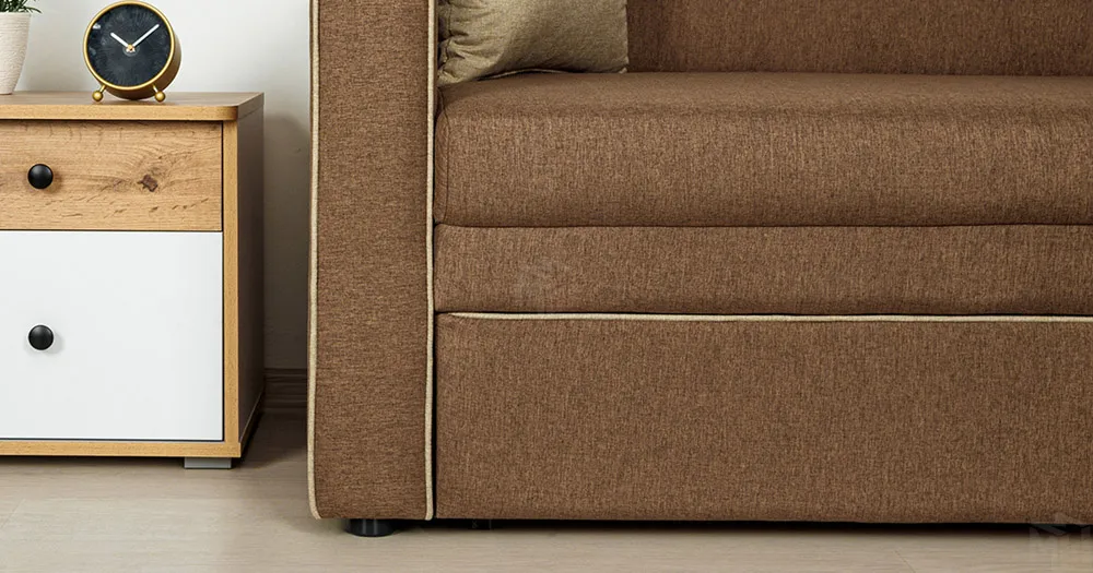 Декоративный контрастный кант по торцу спинки, торцу подлокотника, по верхнему срезу царги. Утяжки с пуговицами на спинке дивана. Две декоративные подушки в контрастной ткани.