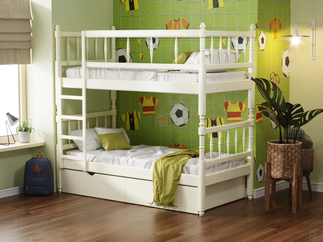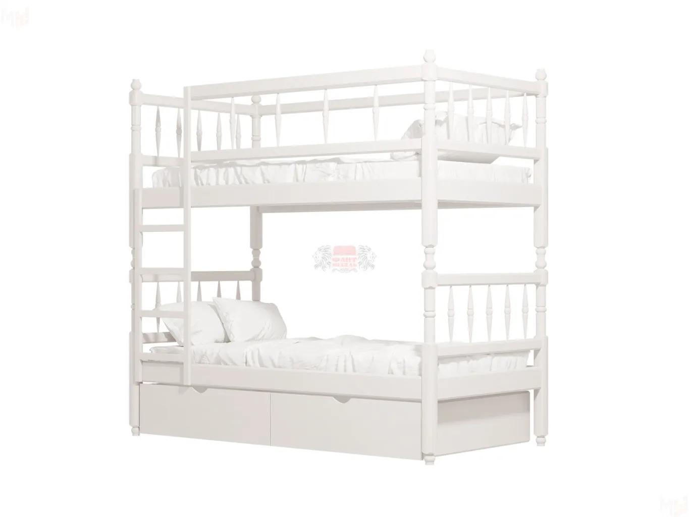 Классический резной дизайн боковин в сочетании с функциональностью двухъярусной кровати внесет изюминку в интерьер любой детской комнаты.Фасад ящиков выполнен из ДСП. Корпус кровати: массив сосны. В основании - листы ДВП.