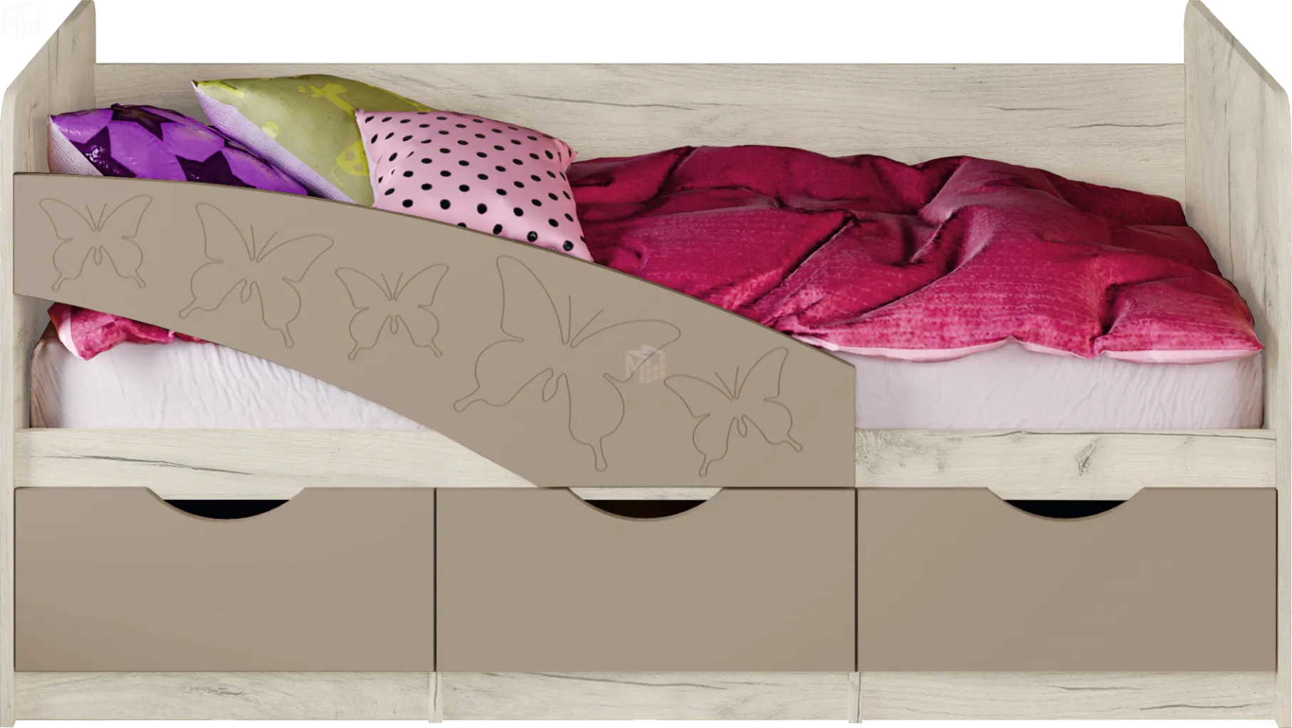 Детская кровать Бабочки - отличное решение для детской комнаты. Фасад кровати оформлен панелью с рельефным изображением бабочек. Кроме декоративной, он несет также защитную функцию – предотвращает возможность падения ребенка на пол во время сна.