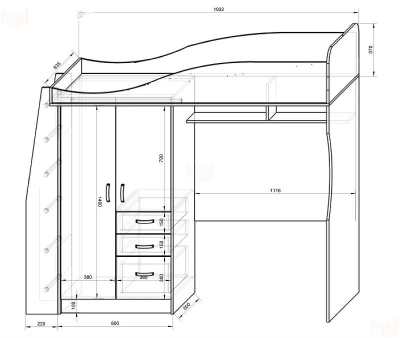 Кровать чердак 1932х1890х840 мм. Спальное место 1900х800 мм.
