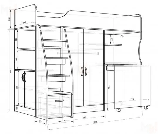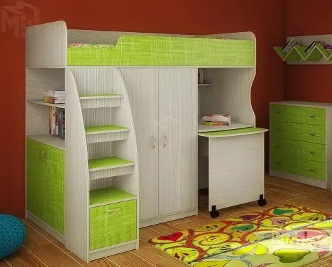 Лестница полностью изготавливается из ЛДСП, включая поперечные перекладины. Нижняя ступень представляет собой вместительный выдвижной ящик. Для хранения детских вещей предусмотрен шкаф с внутренней штангой и верхней полкой. С боковой стороны нижний ящик включает в себя горизонтальные полки с дверью, а верхние полки полностью открытые.