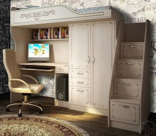 Кровать-чердак ФКК-4 серии Классика с лестницей-комодом ФКК-13/8 для девочек в возрасте от трех лет.