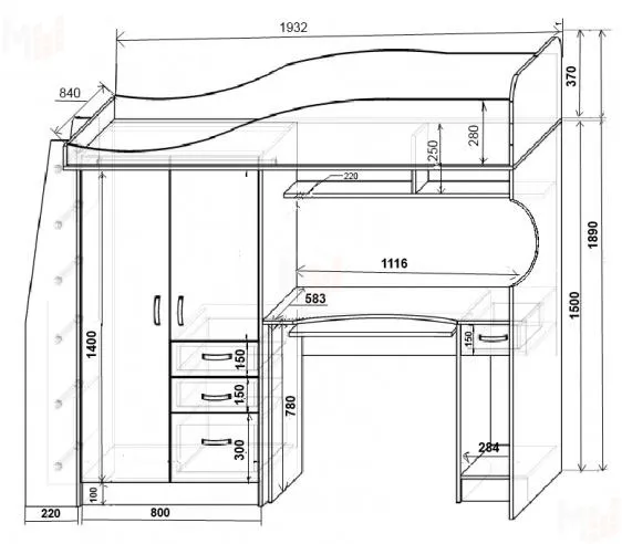 Используется в качестве спального места, учебы и хранения вещей. В конструкции предусмотрены верхнее спальное место 1900х800 мм, двухдверный шкаф (внутри - штанга) с выдвижными ящиками и письменный стол.