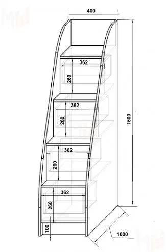Тумба-лестница - отдельный модуль, который приставляется со стороны выпила. Внутри предусмотрены ящики для хранения: три выдвигаются на роликовых направляющих, верхний открывается с помощью двери.