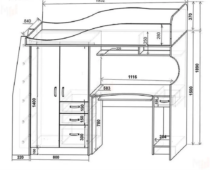 Кровать-чердак 2155х840х1890 мм. Спальное место 1900х800 мм.