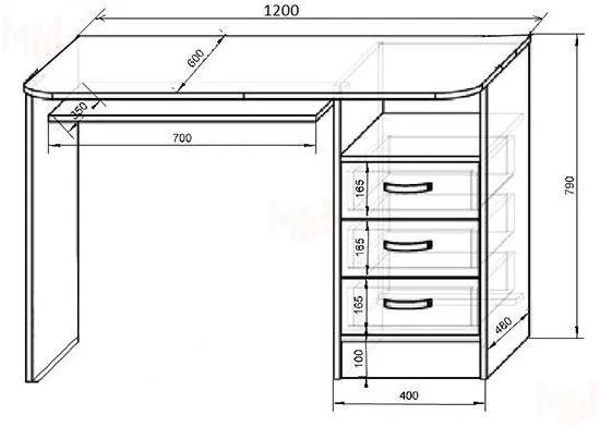 Письменный стол ФУТ-13/1 с боковой тумбой на три ящика, который приставляется перпендикулярно к чердаку, так как прямо он не войдет в нишу.