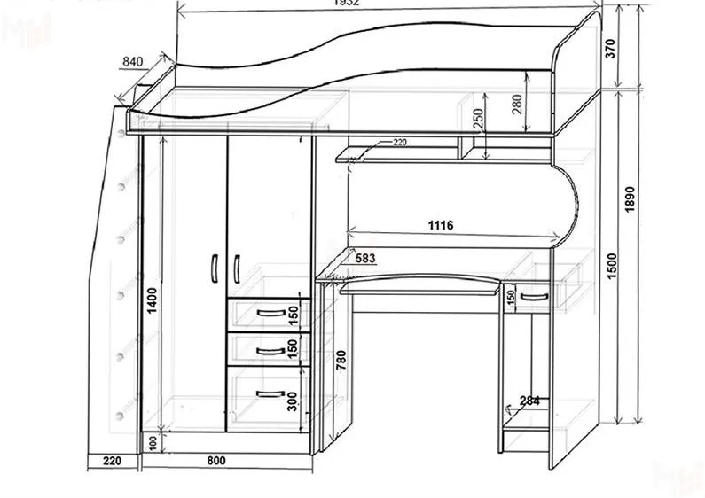 В чердак ФУТ-4/1 входят спальное место 1900х800 мм, двухдверный шкаф (металлическая штанга и три ящика), полка для книг и лестница.