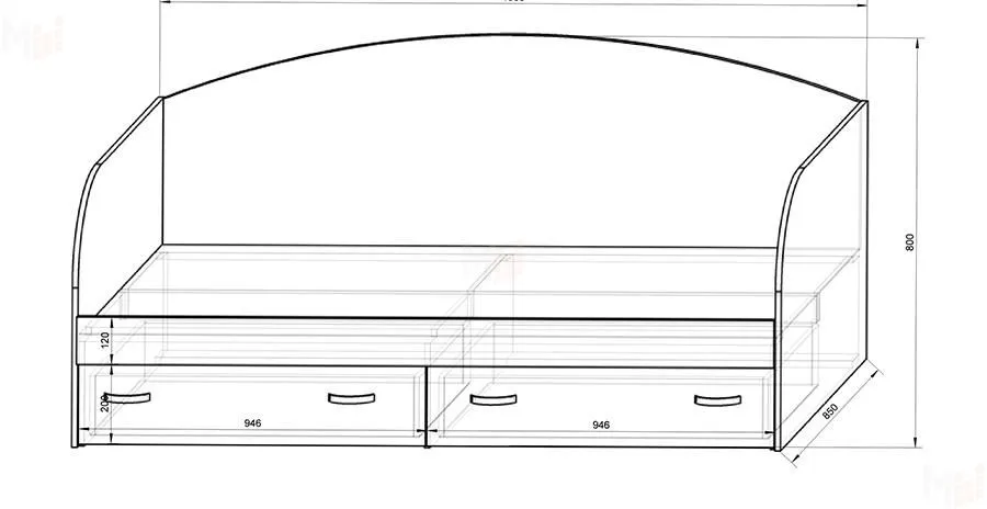 Нижняя кровать имеет конструкцию диванчика, где предусмотрены обязательно высокие боковины и задняя спинка. Ложе оборудовано листом ДСП, и под ним располагаются два ящика для белья.